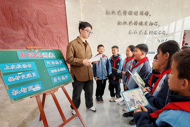 活动中,小学教育专业大学生们创新采用“情景课堂”教学模式,在纪念馆内为留守儿童生动演绎抗日英雄的故事。在抗战文物展区,退役大学生士兵赛山古丽指着一支锈迹斑斑的老式步枪,深情讲述:“这支枪曾经属于一位抗日小战士,他和雨来一样勇敢。在一次战斗中,他一个人击毙了7个敌人……”孩子们听得入神,仿佛穿越时空回到了那段烽火岁月。