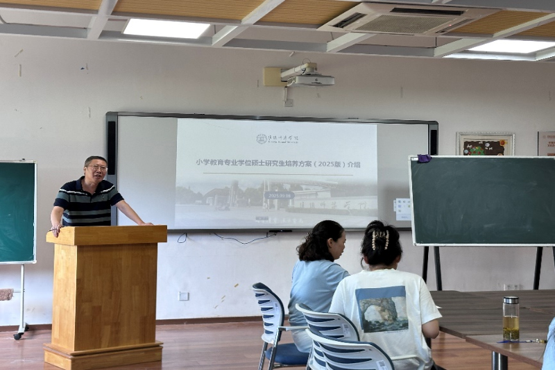 随后,陈太忠就《小学教育专业学位硕士研究生培养方案(2025版)》进行了深入解读。他从培养定位与目标、培养方式与导师指导、课程设置与学分、专业实践、学位论文要求等关键环节出发,细致剖析了本专业的培养方案与毕业要求。陈太忠鼓励新生们尽早确立学术目标,科学规划研究生生涯,充分利用学院优质资源,不断提升自身的创新能力和实践能力。