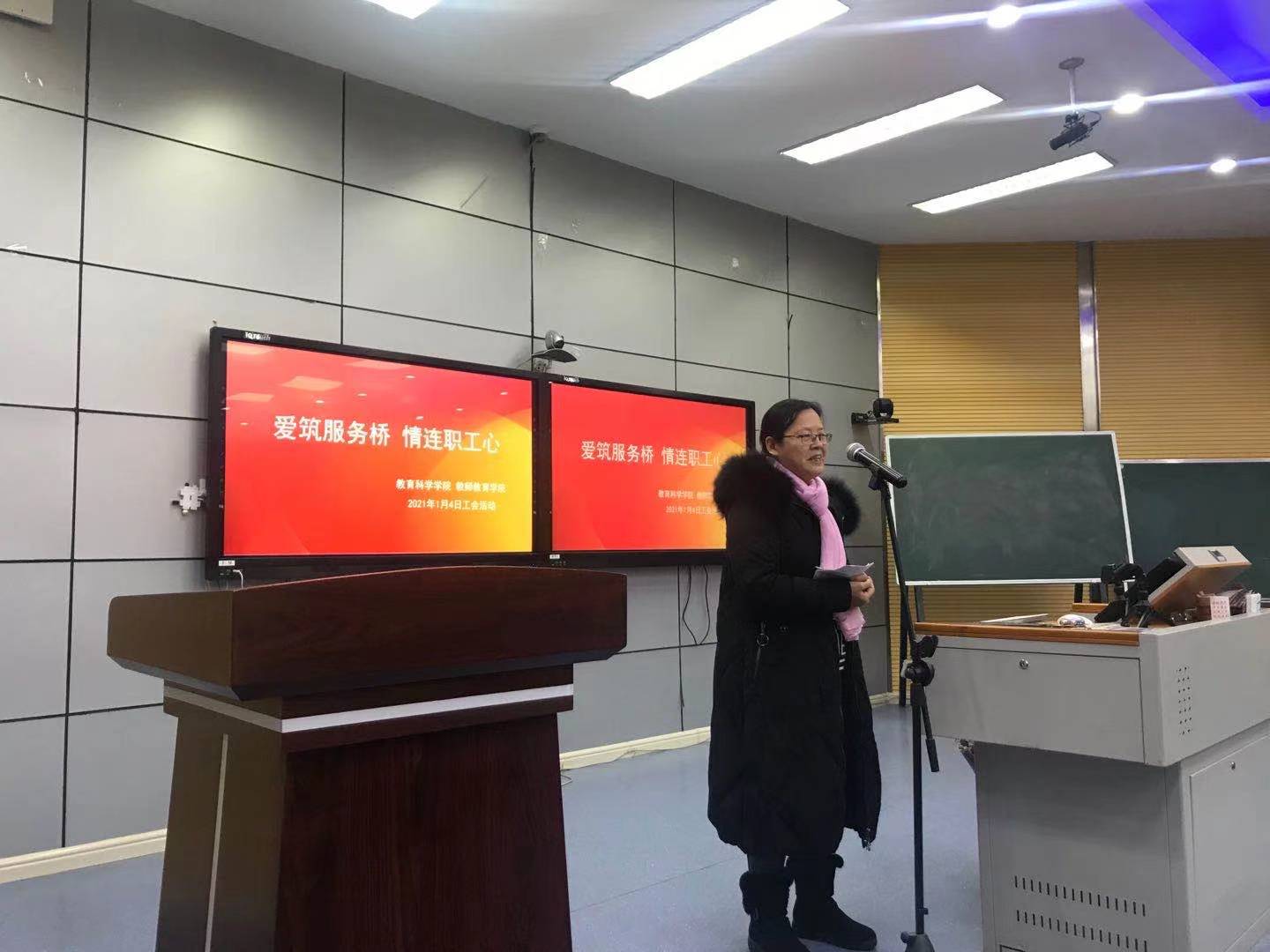 教科网1月5日电(记者 武美贤)为迎接新年的到来,丰富教职工业余文化生活,同时进一步推进教职工文化建设,1月5日下午,教育科学学院(教师教育学院)分工会在2号楼智慧教室举行了以“爱筑服务桥,情连职工心”为主题的迎新春系列活动。活动由教育科学学院(教师教育学院)分工会主席李文军组织进行,全院教职工齐聚一堂,在欢歌笑语中共迎新春。