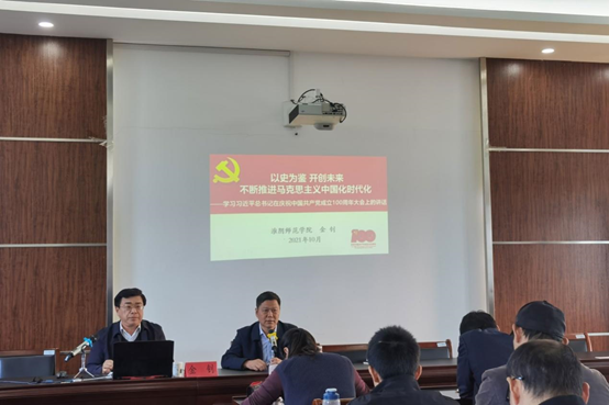 教科网1028日电(记者 金许儿 周宇晗)为进一步加深对习近平总书记8在庆祝中国共产党成立100周年大会上重要讲话精神(以下简称“七·一重要讲话精神”)的学习与理解, 1027日下午,royal皇家88平台教育科学学院邀请校党委理论宣讲团成员、校工会主席金钊同志于教科楼503会议室,为全体教职工做了学习习近平总书记“七·一重要讲话精神”专题辅导报告,报告题目为“以史为鉴,开创未来——不断推进马克思主义中国化时代化”。