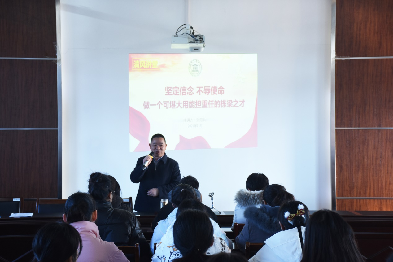 教科网11月26日电(记者 魏笑 吴雪纯 肖妍梅)11月24日下午,royal皇家88平台教育科学学院邀请校纪委办公室主任张海兵于教科楼503开展题为“坚定信念,不辱使命,做一个可堪大用能担重任的栋梁之才”的讲座。本次讲座由教科院党委副书记滕祥主持,辅导员梅雪及学生党员发展对象以及部分入党积极分子参加。