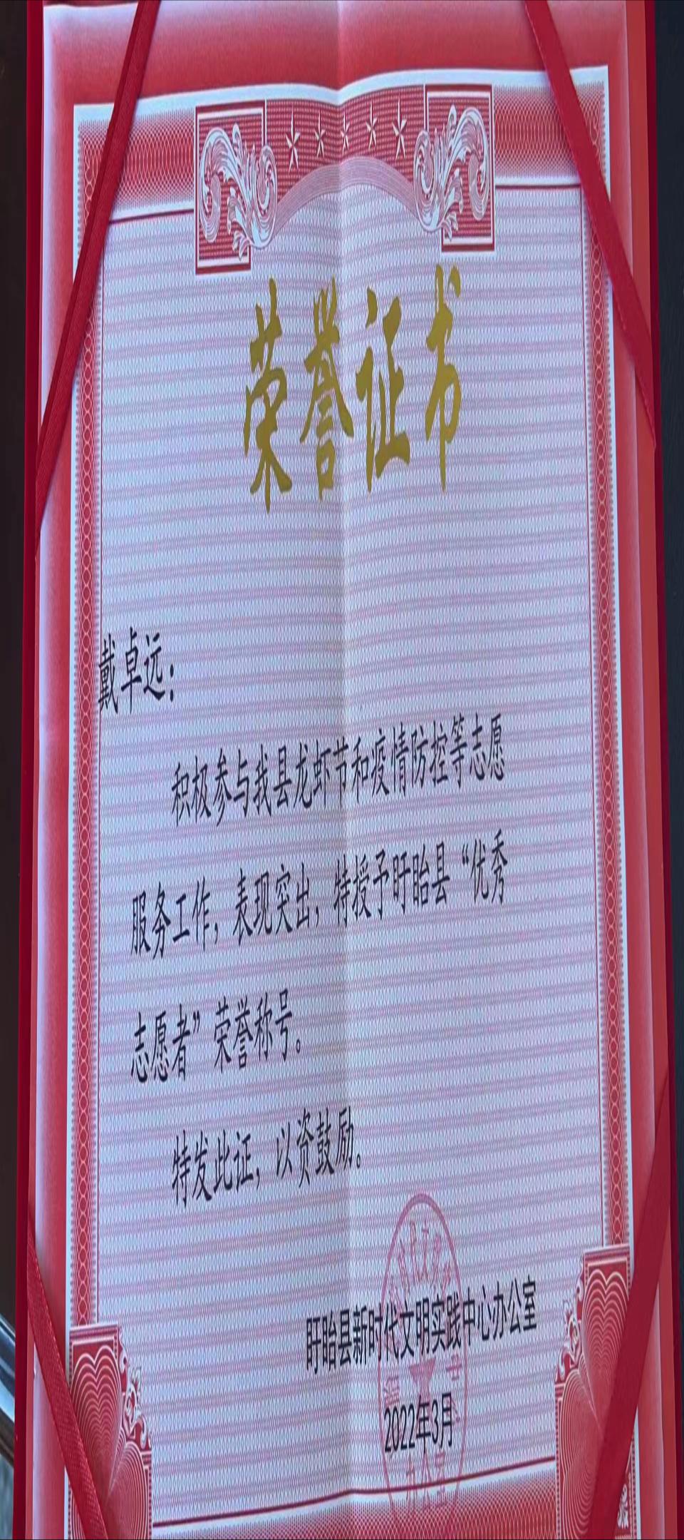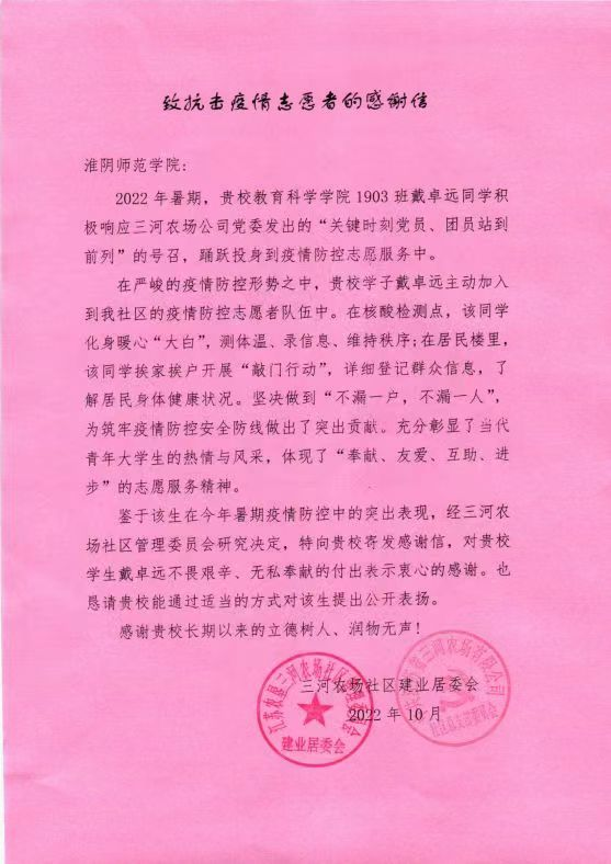 三河农场社区建业居委会在信中表示:戴卓远同学主动加入社区的疫情防控志愿者队伍,为筑牢疫情防控安全防线做出了巨大的贡献,充分彰显了当代青年大学生的热情与风采,更体现了“奉献、友爱、互助、进步”的志愿服务精神。