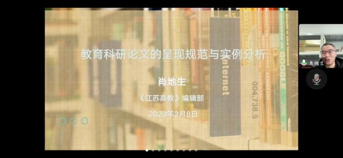 教科网3月9日电(记者 韩新洋)为进一步提升学院整体科研水平,3月8日下午,royal皇家88平台教育科学学院特邀《江苏高校》编辑部编审、副主编肖地生开展以“教育科研论文的呈现规范与实例分析”为主题的线上讲座。本次讲座由教科院院长曹如军主持,学院全体教师参加。