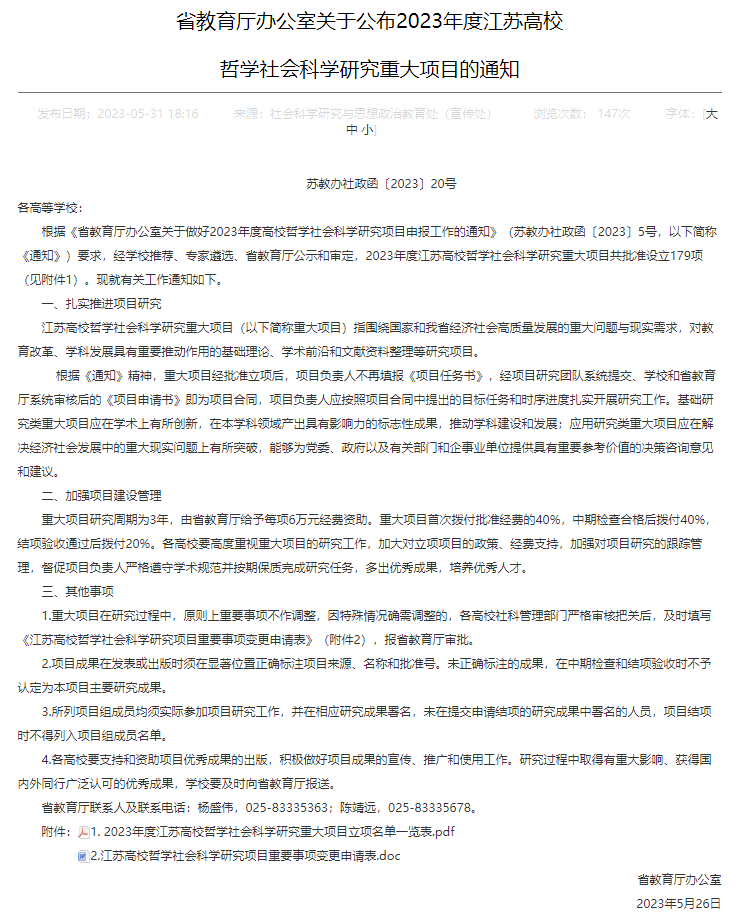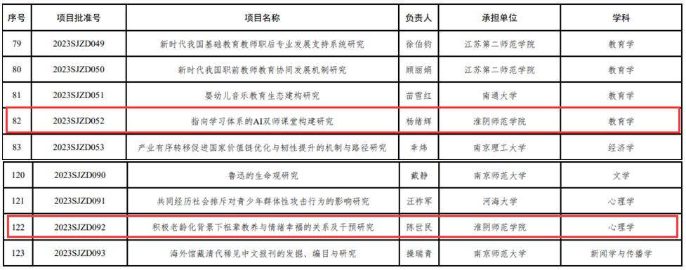 教科网6月9日电(记者 杨绪辉)近日,江苏省教育厅公示了2023年度江苏省高校哲学社会科学研究重大项目评审结果,我院杨绪辉老师申报的“指向学习体系的AI双师课堂构建研究”、陈世民老师申报的“积极老龄化背景下祖辈教养与情绪幸福的关系及干预研究”两个项目榜上有名,为2023年度学院高级别项目的立项工作取得了开门红,同时也为推进学院高质量发展贡献了力量。