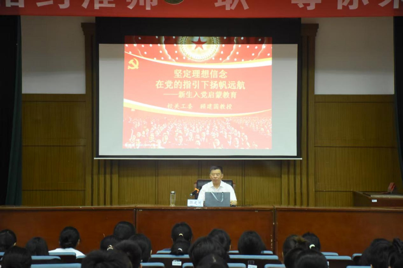 接着,顾建国指出,加入中国共产党要有“一个坚定”“一个主动”“二个了解”。他表示,端正入党动机,是争取入党的首要问题,并向同学们详细地介绍了入党流程及党员组织发展的基本程序。最后,顾建国呼吁全体2025级新生接续奋斗、勤奋学习、筑梦未来,把个人的理想和追求融入到国家和民族伟大复兴的新时代进程中,积极主动地接受党组织的培养和考验,力争早日加入伟大、光荣、正确的中国共产党。