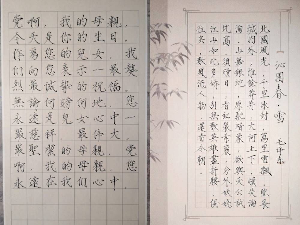 各班还开展了形式多样、内容丰富的活动,如教科1907班团支部以书法和绘画等方式表达自己对全会精神的理解和勇担使命、接续奋斗的决心。苏婉萱同学同学用手中的笔写出对先辈们艰苦卓绝的努力的敬佩和赞美,并分享了自己对祖国未来的展望和人生计划的构想。