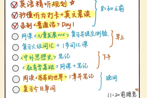 本次活动共有两种参与形式。一是“早知国家事”线上打卡活动。共收集选手们观看新闻的照片及其感受等作品四十余件。选手们的作品内容丰富,形式多样,或众志成城,共击疫情;或信心满满,坚信天佑中华,我们终将战胜病毒;或许下美好心愿:愿疫情早日结束,岁月静好,你我安然。充分彰显了教科院学生在万众一心抗击疫情的特殊时期,关心国家大事,了解疫情形势的责任与担当。二是“共勉于清晨”线上打卡活动,活动分为两步:制定计划,打卡检验完成的照片。学生们对此广泛关注,其中唐诗洁同学的作品生动地展现了早晨的宝贵及学习的过程,体现了大学生的昂扬向上、积极努力的精神面貌。教科院学生宋瑜的一张时间表,充分把握了整个早晨,以实际行动践行了一日之计在于晨。展现了教科学子朝气蓬勃、勤奋好学的精神面貌。线上活动根据题材内容及艺术性进行评分。