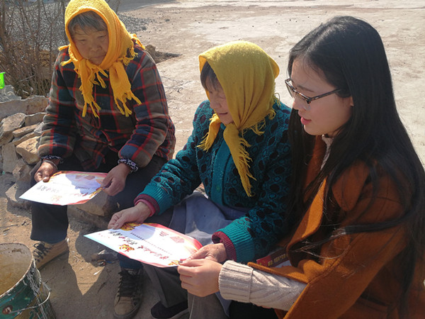 内容丰富的宣传单,结构简明的内容分析,在志愿团队成员张云蔚的手中,成为了宣讲十九大精神的独家法宝。家住连云港的张云蔚利用寒假的时间,精心准备了大量的宣传单。在生活节奏较快的都市,结构简明的宣传单页为忙碌的市民提供了快速了解十九大相关知识的机会,为期一周的十九大宣讲活动早已不再局限于报告会,“一次性”宣讲变为“裂变式”宣传,“被动式”听讲变为“互动性”交流,时间更加机动,形式更加灵活,方法更加新颖。