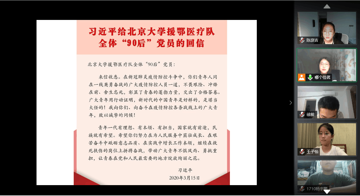 学生第一党支部书记章佳茗通过腾讯课堂将《习近平回信勉励北京大学援鄂医疗队全体“90 后”党员让青春在党和人民最需要的地方绽放绚丽之花》完整诵读了一遍,督促大家学习陈宝生部长的讲话,并在接下来的时间中鼓励大家开麦谈一谈对“把理想信念作为思想行动的‘总开关’”、“把爱国情怀作为成长成才的‘定盘星’”等六个观点的理解。