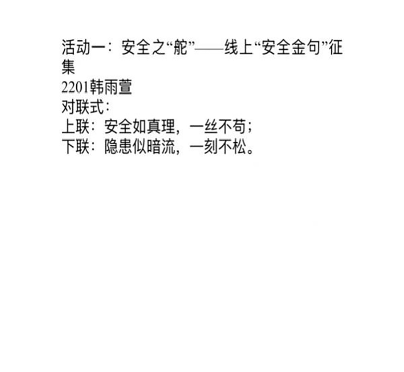 其中教科2201韩雨萱的作品,采用了对联的形式给人眼前一亮,内容简单易懂,语言朴实,对仗工整。
