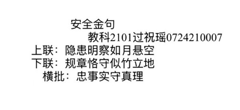 教科2101过祝瑶的作品,也采用了对联的形式,却是不一样的风格,辞藻华丽,将周恩来崇高精神风范与安全意识紧密结合。