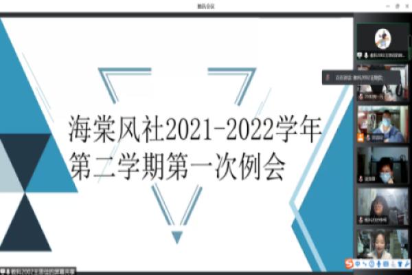 翔宇网3月28日电(记者 周逸凡 王思佳)3月27日晚,教育科学学院海棠风社在线上召开了2021-2022学年第二学期的第一次例会。本次会议由负责人王思佳主持,海棠风社全体成员参加。本次例会主要分为两个流程:一、对上个学期进行总结;二、社团本学期的规划。