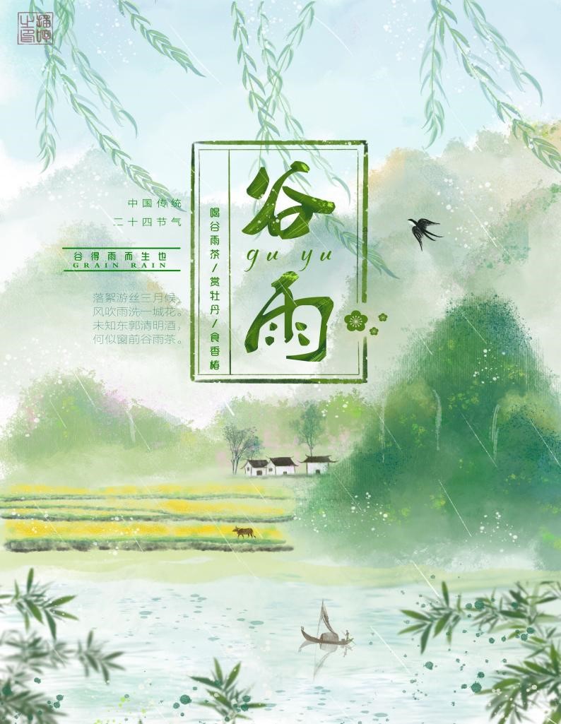 清明麻,谷雨花,立夏栽稻点芝麻。人们对谷雨时节的喜悦与感激汇聚成一个个美好的传统习俗;如祭海、吃春、喝谷雨茶等有趣的风俗习惯早已成为了这个时节的独有象征。同学们用身边的电子工具,将习俗融进画中,表现于文字里,制作出一张张精美的谷雨习俗海报。图为1905施明慧同学的海报作品,巧妙的元素组合,将谷雨时节的朦胧之感表现的淋漓极致。农田、村落在山水的交相辉映下格外静谧安宁,帆动燕舞柳飘飞,好一幅小村谷雨之景。同时,将谷雨时节的习俗巧妙的标示出,设计感十足。