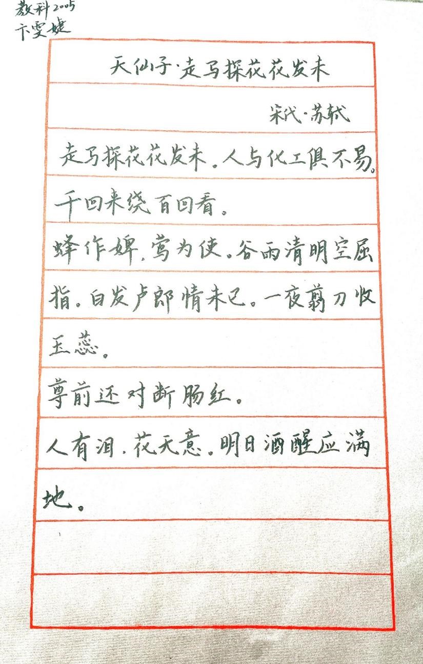 经过为期一周的线上征集,活动取得了满意成效。许多同学踊跃参与其中,共赴这场雨季之约,以多种多样的形式表达了自己对谷雨时令的体悟,提交的作品各具特色、情感真挚丰富。此图为卞雯婕同学的书法作品。笔触苍劲有力,走法行云流水,以自己对谷雨时节及诗歌的感悟,带我们一同领略着古文化的魅力。笔墨交织中,处处流露出其深厚的书法功底。