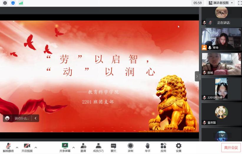 教科网11月29日电(记者 肖雨瑶 史文欣)为深入贯彻落实《中共中央国务院关于全面加强新时代大中小学劳动教育的意见》教育引导大学生崇尚劳动、尊重劳动、热爱劳动,培养德智体美劳全面发展的社会主义建设者和接班人,教科2201团支部线上开展“‘劳’以启智,‘动’以润心”劳动公开课,团支书秦琦担任此次主讲人。