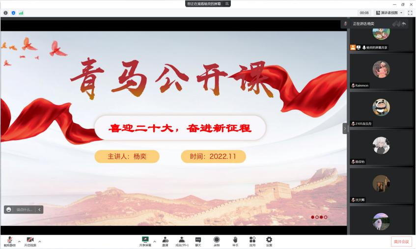 教科网12月2日电(记者 张雨萌)为进一步学习宣传贯彻党的二十大精神,增强广大青年团员坚定“四个自信”,教育科学学院于11月29日线上开展青马公开课,教科院学生会学习部部长杨奕就“喜迎二十大,奋进新征程”这一主题展开深入交流。