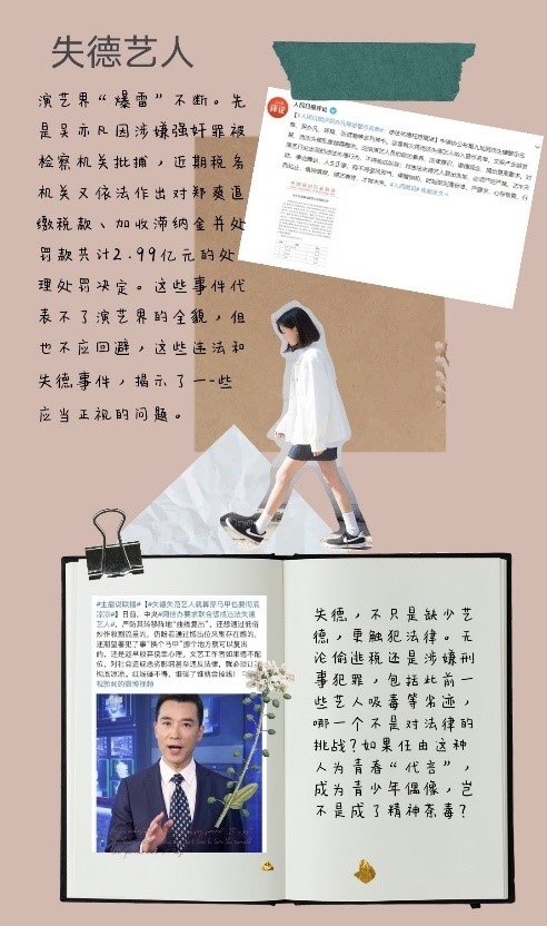 此次活动形式多样,不仅局限于抒发有关失德事例的感想,同学们还可以根据自己的想法进行创作,例如手账、手抄报、绘画等。在活动过程中,很多同学对于失德事例都有自己独特的思考与见解,并且大多结合时事热点。
