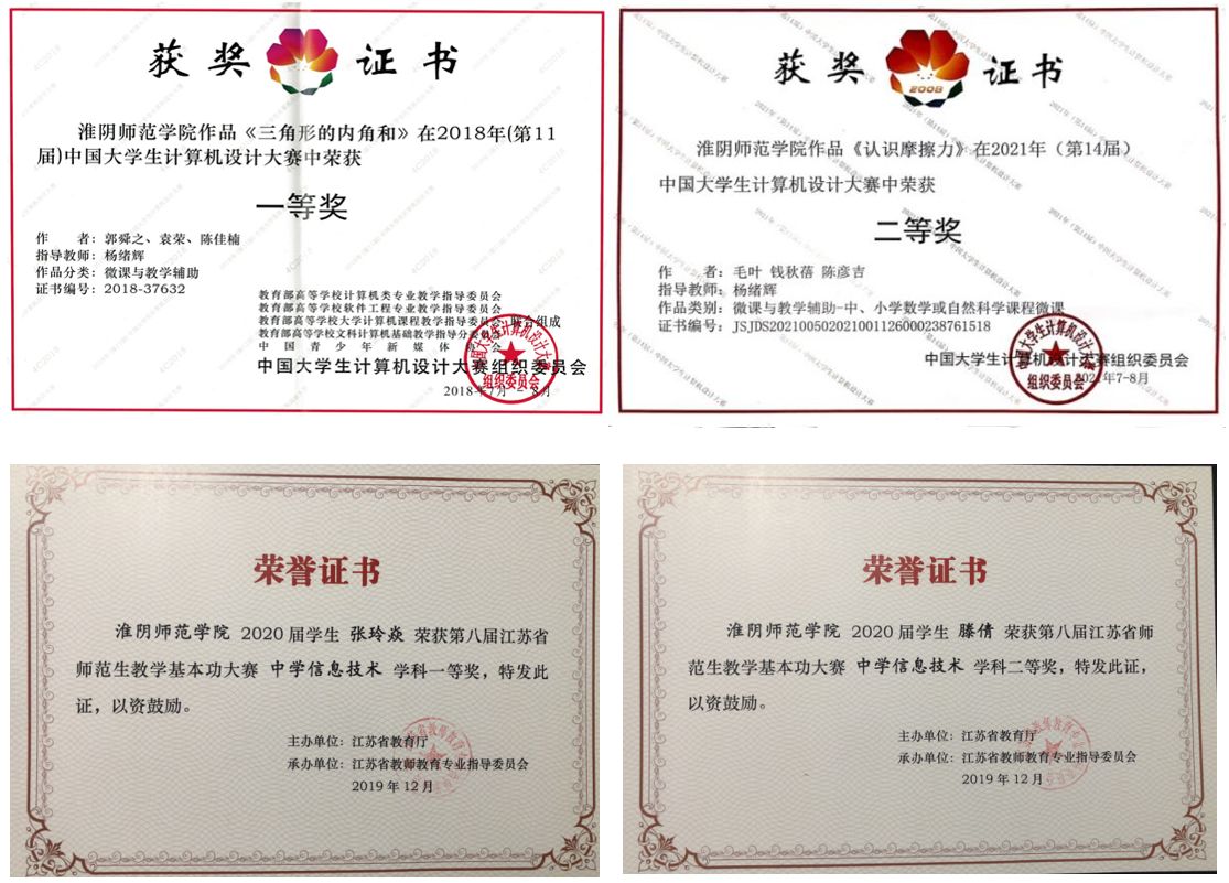 人才培养的特色定位使师范生具备扎实的专业素养与多元化能力。专业学生积极参与信息技术相关的竞赛,近四年,近百人次在领航杯、计算机设计大赛等省级以上学科竞赛中奖项,尤其在中国大学生计算机设计竞赛中表现突出,近五年(2017-2021)获得一等奖一次,二等奖六次,三等奖六次的好成绩。在近三年的省师范生教学基本功大赛(信息技术学科)中获得一等奖2项,二、三等奖3项,获奖率及一等奖人数始终位居全省同类高校前列