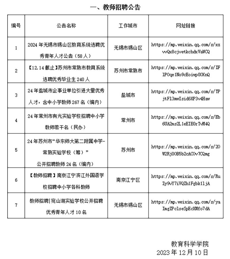 教育科学学院2023-2024学年第一学期第15周招聘信息