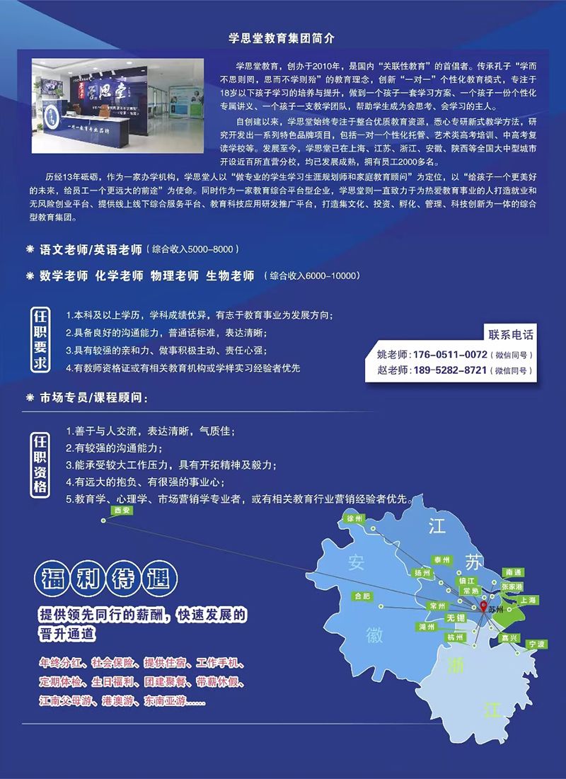学思堂创办于2009年,是国内“关联性教育”倡导者。传承孔子“学而不思则罔,思而不学则殆”的理念,创新“一对-”个性化辅导模式,专注于18岁以下孩子学习的培养与提升。“学思堂教育”是经主管部门审批的“中小学规划辅导服务连锁机构、“家庭教育研究推广机构”,成立至今已在中国5省10多个城市建立了近百家直营分校,员工3500多人。