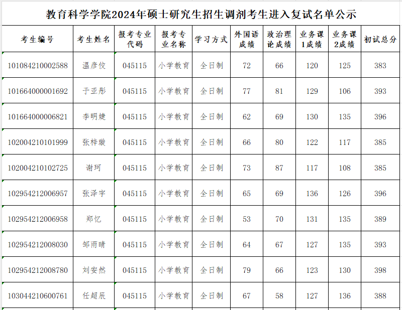 教育科学学院2024年硕士研究生招生调剂考生进入复试名单公示