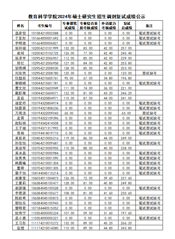 教育科学学院2024年硕士研究生招生调剂复试成绩公示