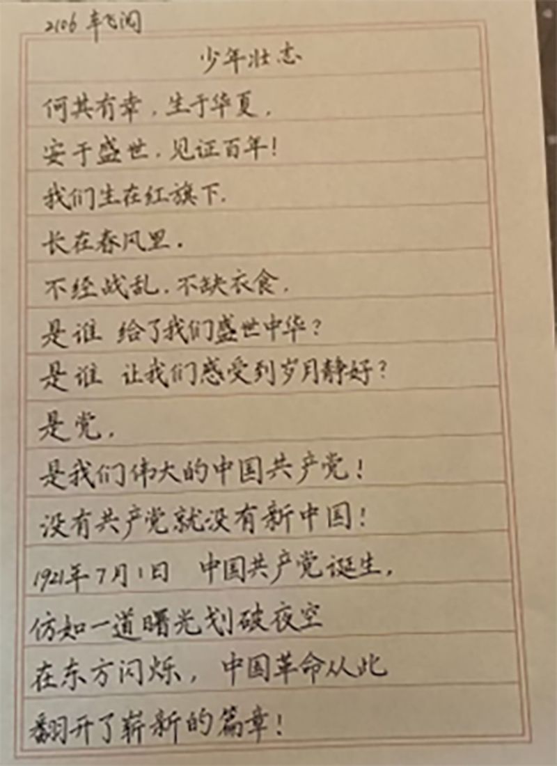 百转千回,百炼成钢。车飞阅同学的书法作品生动传神。一个个慷锵有力的的笔锋组成了一个完整的大字,正如一个个个人组成了我们的祖国。书法之美美在于表,也美在骨,更美在书法中蕴藏的浓浓的深意。