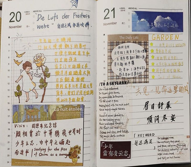 手账比赛活动圆满落幕,展现创意与艺术的完美结合。其中,2202班的朱文婧同学学习了周恩来总理的学习精神,在手账中表达了对周恩来总理的深切崇拜之情。