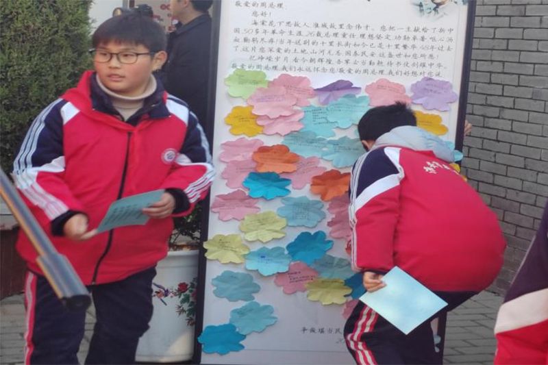 “同写一封信”,大中小学生将自己想对总理说的话寄托在海棠花卡片上,而后一起贴在共同的一封信上。