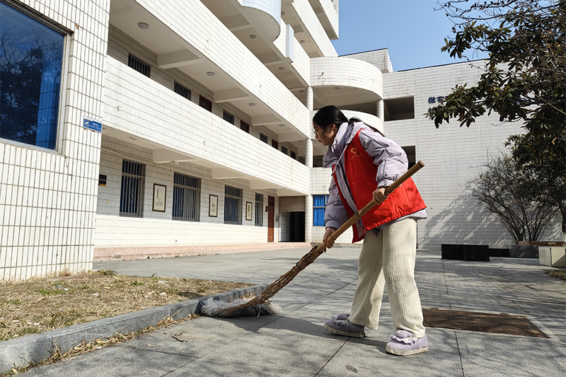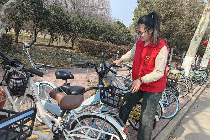 志愿者们清扫落叶,整理自行车,使教学楼周围的环境更加的干净整洁,以雷锋精神助推了文明校园的建设。