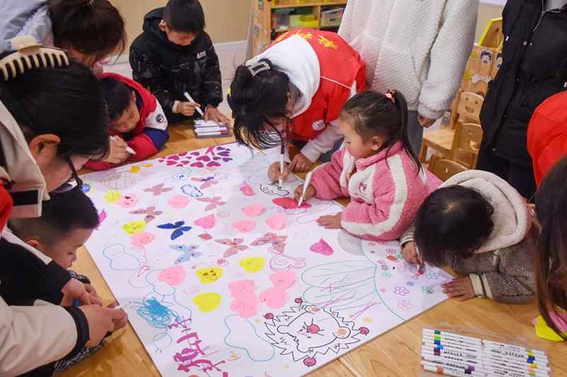 志愿者们来到淮安市博爱康复中心,和小朋友们进行互动,共同完成手工作品。他们和小朋友们共同装饰心愿板,将写满心愿的便利贴贴在白板上,并在白板上绘画来进行装饰,志愿者们鼓励孩子们自由探索和尝试,通过艺术的力量,建立更为丰富和多元的世界观。接着,他们陪小朋友们一同“变废为宝”,将泡沫条装饰城杨柳画,让小朋友们在动手的同时也学习到环保知识。随后,志愿者们在给小朋友们讲故事的同时,手把手教他们认识故事中的汉字,一次短暂的陪伴不仅为小朋友们带来温暖与关怀,也增进了志愿者与他们之间的交流。
