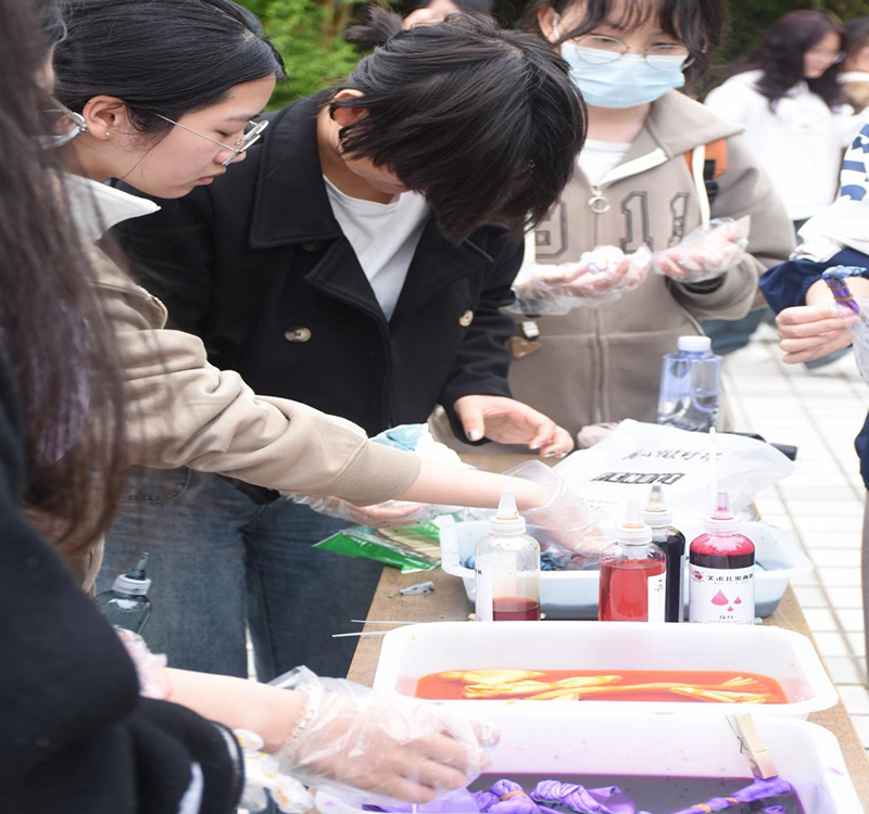 本次活动举办面对对象为淮师全体学生,参与人员众多,首先由负责人介绍此次扎染活动的历史背景,后亲自示范教学,在过程中,同学们积极参与,发挥自己的动手能力,创作了一幅幅属于自己的扎染作品,其中,色彩丰富,图案精巧。此次活动让同学们在心中厚植文化底蕴,传承中华民族的传统工艺,培养了他们的创新精神,同时,进一步提升了学生们的艺术情操,丰富了校园文化生活。大家在活动中邂逅扎染了艺术,充满了乐趣,也在新奇的体验中传承了非遗文化。