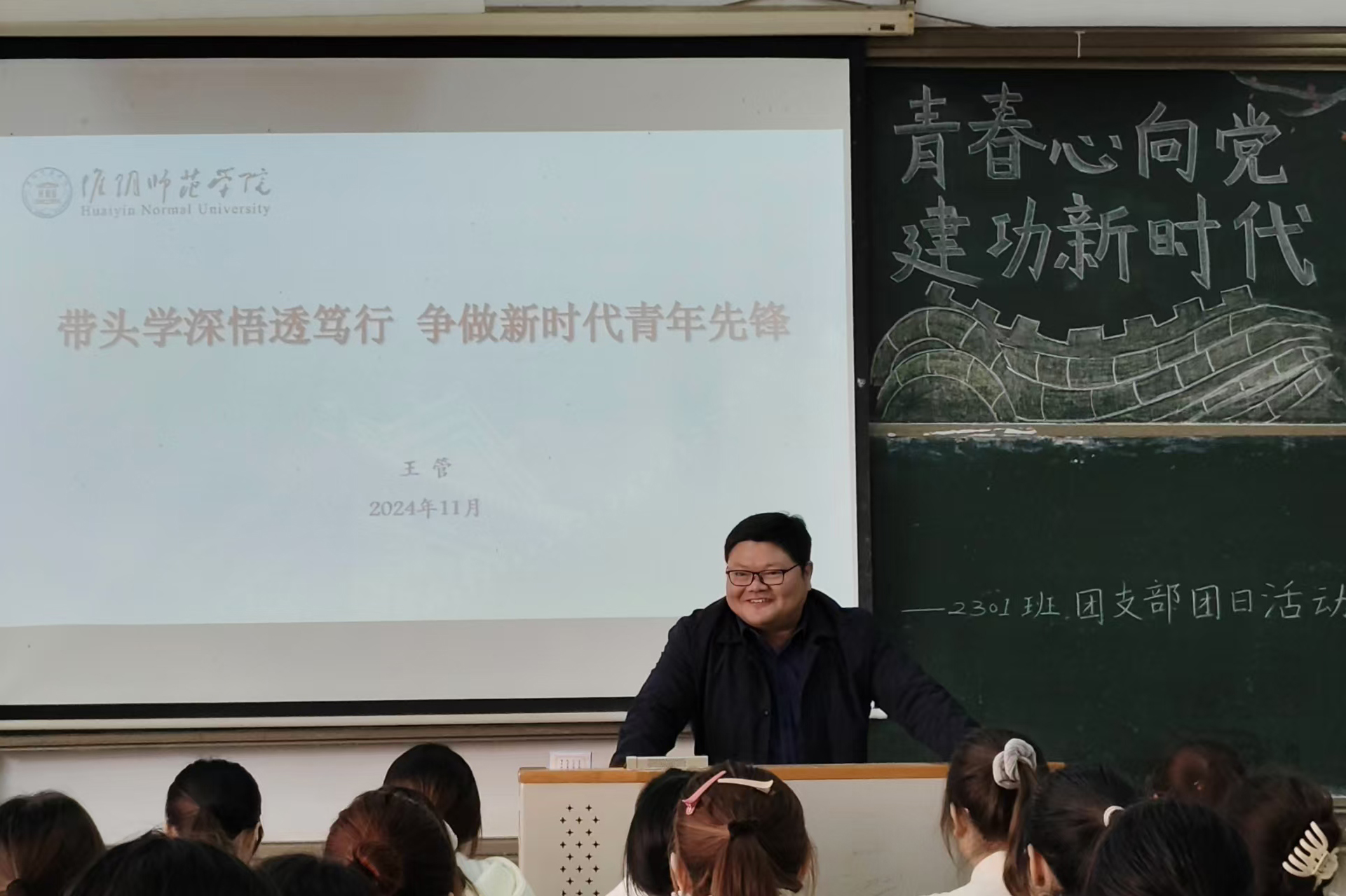 随后,团支书邀请王管部长为同学们上一节公开课。在课上,王管部长表达了对同学们的亲切问候,对同学们的日常学习训练提出了高度赞扬。同时,分享了自己曾经在大学时的故事,鼓励同学们树立远大理想,敢于追求梦想。希望同学们作为新时代的新青年应当有爱国心、报国志,努力成为德、智、体、美、劳全面发展的新时代青年,为国家教育事业贡献自己的力量。他用富含感情的语言深深地感染了台下的师生,使在场学子对梦想的追求有了更深层次的理解。王管部长的发言不仅是对青年学子的激励,也是对新时代青年的期望。他呼吁同学们在稍纵即逝的大学四年,要脚踏实地提升自己,创造出缤纷多彩的人生。通过这次团日活动,王管部长的发言和班级的精心组织,让在场的每一位教科2301班同学都深刻感受到了作为新时代青年的责任与使命,激发了他们树立远大理想,为国家发展而不懈奋斗的决心。
