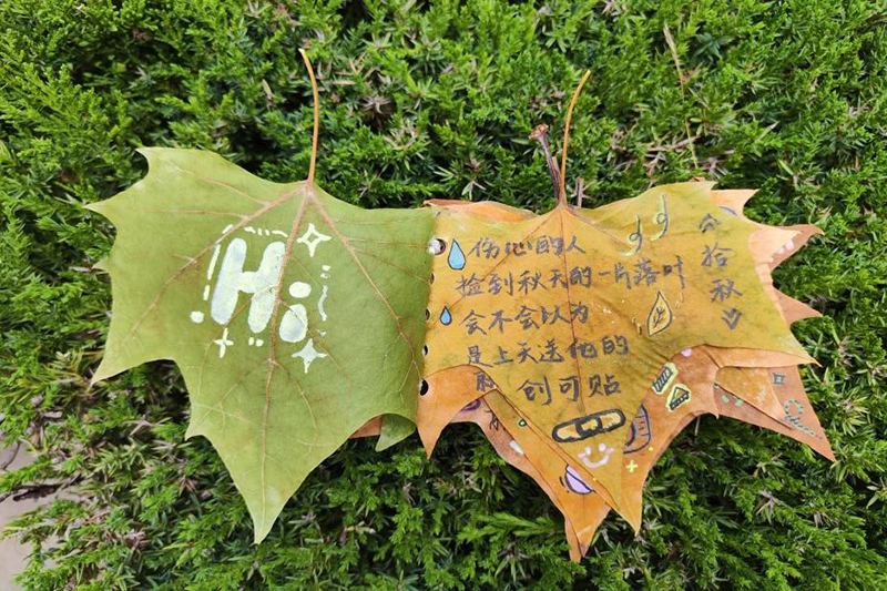 本次活动采取线上组织和线下收集两种方式。要求同学们将落叶制成留言簿形式,其留言内容需要符合秋日主题,包括不限于诗歌、科普知识、情绪语句等。此次活动中,同学们纷纷挑选出符合心意的落叶,并写下了自我的感悟,得到心灵的慰藉。