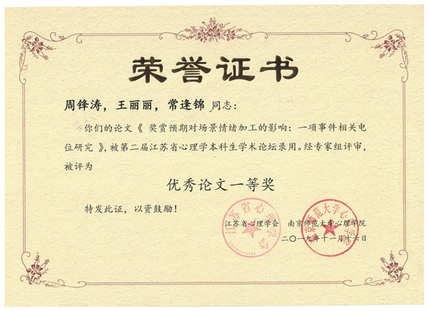 论坛伊始,南京师范大学心理学院汪凤炎教授作出“关于科研的三个问题”的报告。大会主题报告环节,教科院周锋涛阐述了题为“奖赏预期对场景情绪加工的影响:一项事件相关电位研究”的汇报。报告完毕,南通大学的张鹏程老师、苏州大学的李宏利老师分别对此做出点评。当天下午的分组报告中,教科院的吴丽娟、徐前、赵丽萍三位同学也分别进行了论文汇报。
