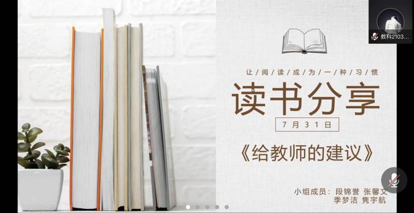 教科网8月3日电(记者 张金)外物之味,久则可厌;读书之味,愈久愈深。读书使人充实,思考使人深邃,交谈使人清醒。为了共同探寻心灵的居所,同享读书之乐,royal皇家88平台教育科学学院行知班于7月31日晚在线上举办了暑假第二次读书分享会活动。本次活动由教科2105班张怡舟主持,行知班全体成员参加本次活动。