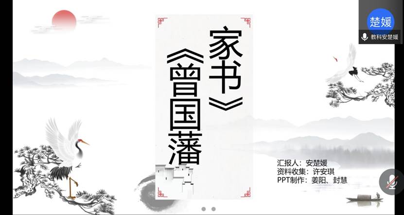 首先由安楚媛代表小组发言。她从作者简介、内容概述、主要思想和读后感悟四个方面对《曾国藩家书》进行介绍。她说,透过曾国藩的家书,我们看到了一代名人重臣深厚的学识造诣和道德修养,感受到了他骨子里那份对家人的浓浓亲情。“家俭则兴,人勤则健;能勤能俭,永不贫贱。”安楚媛用曾国藩的十六字家训与大家共勉,希望大家能不忘初心,清清白白做人,堂堂正正做事,树立时代薪火相传的家风。