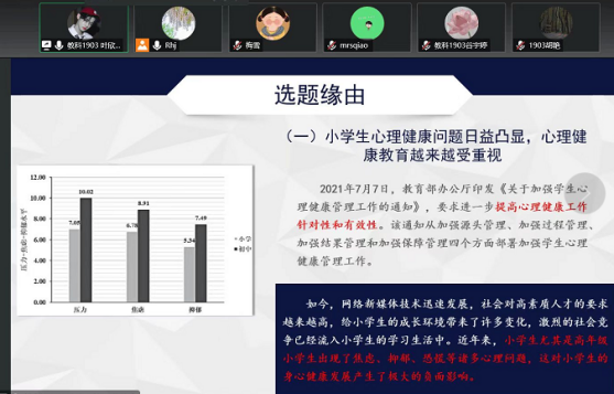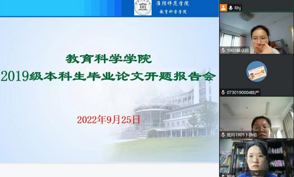 教科网9月27日电(记者 王蕊)毕业论文是本科教学实践环节的重要组成部分,是培养学生科研能力的重要途径。而毕业论文开题报告是本科生毕业论文撰写的重要环节。为了规范本科生毕业论文撰写过程,提高学生毕业论文写作质量,教育科学学院小学教育、学前教育、教育技术学和应用心理学等四个专业,按照《royal皇家88平台教育科学学院2019级学生毕业论文工作的实施意见》文件要求,近期按专业、分小组举行了本科生毕业论文开题报告会。