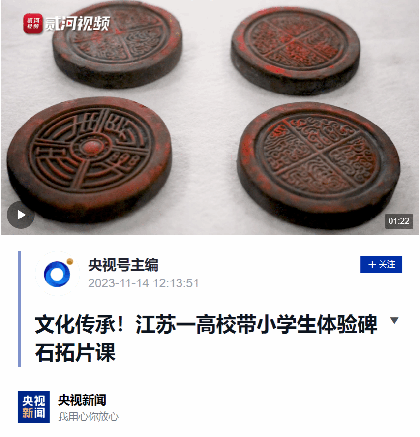 【央视新闻】文化传承!江苏一高校带小学生体验碑石拓片课