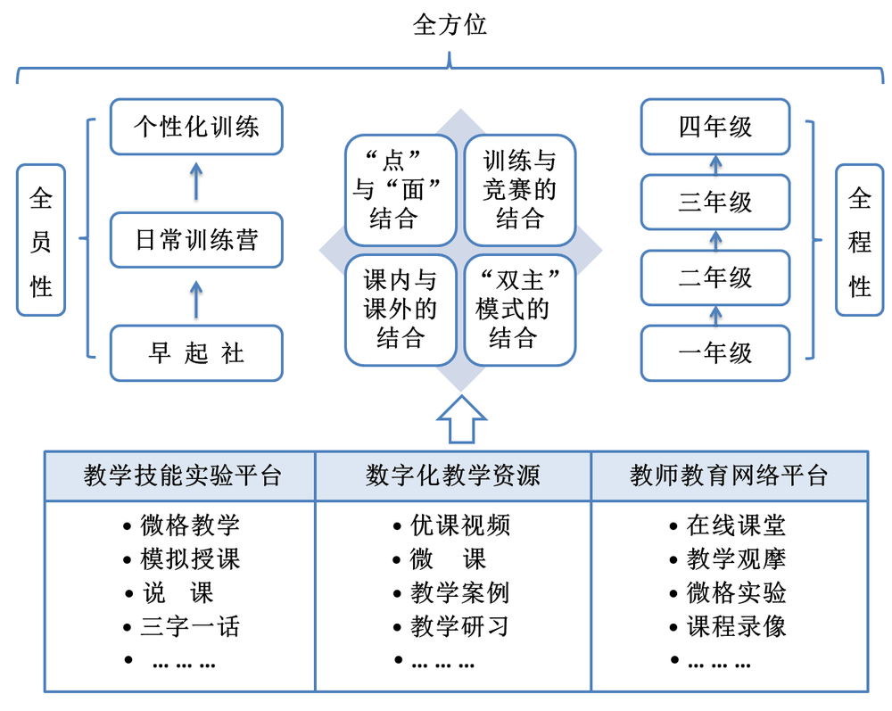 “厚基础”则包括为学生人文精神与科学精神的培育奠基、为专业课程的学习奠基、各专业课程自身强调基础类内容、重视学生“三字一话”等教学技能训练,为学生的专业技能和教育教学能力奠基。